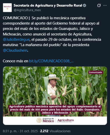 Ante los bloqueos realizados en los últimos días por productores de maíz para exigir mejores condiciones económicas, el Gobierno de México, a través de la Secretaría de Agricultura y Desarrollo Rural (Sader), dio a conocer la mecánica para sostener el precio del grano y evitar pérdidas entre los pequeños agricultores de Jalisco, Guanajuato y Michoacán.El nuevo esquema contempla un estímulo total de 950 pesos por tonelada, integrado por 800 pesos provenientes de la Federación y 150 pesos adicionales de los gobiernos estatales. El apoyo se dirigirá a quienes cultivan hasta 20 hectáreas, que concentran la gran mayoría de las unidades productivas de la región.La medida busca compensar la brecha entre el precio de mercado -por debajo de los costos de producción- y las demandas de los productores, quienes habían exigido un incremento que garantizara rentabilidad. Con este acuerdo, las autoridades pretenden estabilizar la comercialización del grano y reducir la tensión en el campo.Además del apoyo económico, la Sader informó que se instalarán mesas de diálogo permanentes entre agricultores, compradores y autoridades locales para revisar los precios de compra y transparentar los mecanismos de venta, en los que el Gobierno Federal participará como mediador para facilitar los acuerdos.En paralelo, el programa Cosechando Soberanía ampliará su cobertura hacia productores de maíz de pequeña y mediana escala, con créditos a una tasa anual de 8.5%, seguro agropecuario y protección ante riesgos climáticos o fitosanitarios.Como parte de una estrategia de largo plazo, el Gobierno también creará el Sistema Mexicano de Ordenamiento del Mercado del Maíz, que establecerá precios de referencia antes de cada ciclo agrícola y promoverá contratos directos entre productores y compradores.Los productores de Guanajuato, Jalisco y Michoacán podrán consultar la mecánica operativa del aporte federal en el siguiente enlace: https://bit.ly/ApoyoComplementarioBajio.*Mantente al día con las noticias, únete a nuestro canal de WhatsApphttps://whatsapp.com/channel/0029VaAf9Pu9hXF1EJ561i03OF