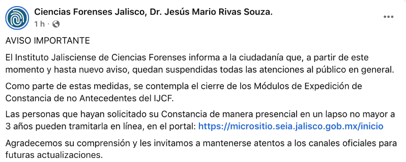 El Instituto Jalisciense de Ciencias Forenses (IJCF) informó la suspensión temporal de todas las atenciones al público en general a partir de este momento y hasta nuevo aviso, como parte de las medidas preventivas implementadas ante la situación actual en el estado.En un comunicado oficial, el organismo precisó que también permanecerán cerrados los Módulos de Expedición de Constancia de No Antecedentes Penales, por lo que no se brindará atención presencial en sus instalaciones durante el periodo que permanezca vigente la disposición. El IJCF indicó que las personas que hayan tramitado su constancia de manera presencial en los últimos tres años podrán obtenerla en línea a través del portal oficial: www.micrositio.seia.jalisco.gob.mx/inicioLa institución exhortó a la ciudadanía a mantenerse informada únicamente por medio de los canales oficiales del Gobierno del Estado de Jalisco y del propio Instituto, y agradeció la comprensión de los usuarios ante las medidas implementadas para garantizar la seguridad del personal y del público. El IJCF destacó que las labores internas continuarán realizándose con personal de guardia y bajo protocolos de seguridad, con el fin de atender los servicios urgentes relacionados con investigaciones en curso o solicitudes de las autoridades competentes.Finalmente, el organismo reiteró su compromiso con la legalidad, la transparencia y la atención oportuna, asegurando que se informará de manera inmediata cualquier cambio o reanudación de actividades presenciales a través de los medios institucionales. EE