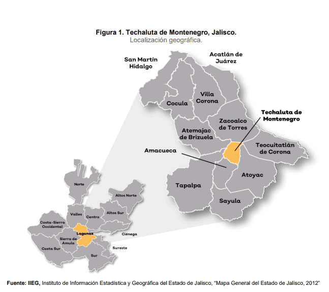 De acuerdo con la página oficial del Gobierno del Estado, localizado en el sur, en la carretera libre a Ciudad Guzmán, rodeado por Atemajac de Brizuela, Teocuitatlán de Corona, Zacoalco de Torres, Atoyac, Amacueca y Tapalpa, y con una extensión de apenas 79.69 kilómetros cuadrados, Techaluta de Montenegro es el municipio más pequeño de Jalisco.