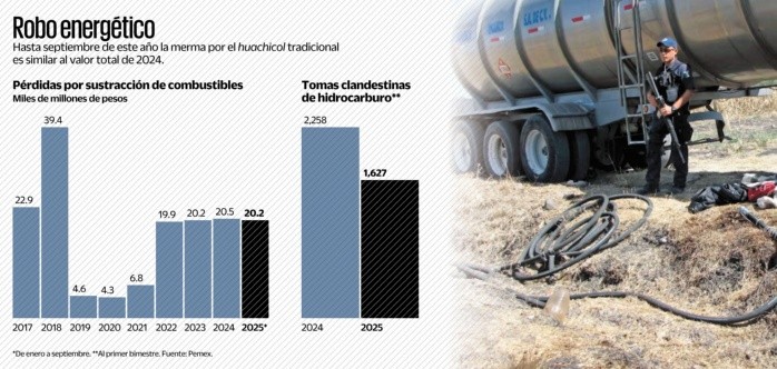 El hurto directo en los ductos continúa afectando al erario federal, con pérdidas estimadas de 20 mil millones de pesos el año pasado, pero se añaden hasta 177 mil millones de pesos por el conocido huachicol fiscal.