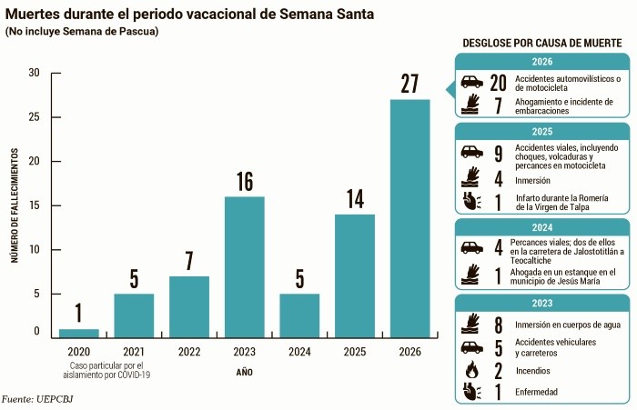 La primera semana del periodo vacacional de Semana Santa en Jalisco cerró con un saldo de 27 personas fallecidas, la cifra más alta registrada en los últimos años para este periodo, de acuerdo con el corte preliminar presentado por la Unidad Estatal de Protección Civil Jalisco (UEPCBJ).El reporte corresponde a los resultados del operativo interinstitucional implementado para prevenir y atender emergencias durante la temporada de descanso. Según las estadísticas, del total de decesos, 13 se derivaron de accidentes automovilísticos, siete de percances en motocicleta y siete más por ahogamientos e incidentes relacionados con embarcaciones.Uno de los casos ocurrió durante los primeros minutos del sábado 4 de abril, cuando un joven de 23 años y una mujer de 40 murieron tras un accidente de motocicleta en la carretera a El Salto, en el cruce con San Martín El Verde. De acuerdo con autoridades municipales, ambas personas se impactaron contra un vehículo Kia de modelo reciente. En el sitio se localizaron daños en la parte frontal del automóvil, así como indicios del impacto. Se presume que el motociclista circulaba a exceso de velocidad y perdió el control tras quedar trabada la unidad. El conductor del vehículo fue retenido.Otro hecho se registró el 28 de marzo sobre la autopista Guadalajara, a la altura del Macrolibramiento, donde un tráiler y una camioneta colisionaron. Tras el impacto, la unidad de carga salió de la carpeta asfáltica y terminó sobre el muro de contención central, dejando una persona fallecida y cuatro lesionadas.Asimismo, el 27 de marzo se reportó otro accidente en el kilómetro 64 de la autopista Lagos de Moreno-Zapotlanejo, donde un camión pesado y un vehículo tipo sedán chocaron, con saldo de una persona muerta, dos personas prensadas y dos más lesionadas.La UEPCBJ indicó que aproximadamente el 76% de los fallecimientos están relacionados con hechos de movilidad, lo que confirma que los principales riesgos durante este periodo continúan asociados a conductas imprudentes al conducir.Además, cerca del 80% de los decesos se registraron en municipios del interior del estado, mientras que el resto ocurrió en el Área Metropolitana de Guadalajara.De acuerdo con análisis del Instituto Mexicano del Transporte (IMT) y la Secretaría de Infraestructura, Comunicaciones y Transportes (SICT), alrededor del 71% de los accidentes carreteros se deben al factor humano, como el exceso de velocidad, distracciones al volante, no respetar señales de tránsito, invasión de carriles o conducir bajo fatiga.Ante este panorama, autoridades estatales reiteraron el llamado a mantener medidas de prevención durante el periodo vacacional.Durante el periodo vacacional de marzo, correspondiente a Semana Santa y Pascua, se registra el mayor número de llamadas de emergencia reales en Jalisco, de acuerdo con datos presentados por la Secretaría de Salud Jalisco y el Consejo Estatal para la Prevención de Accidentes (CEPAJ).Las autoridades reiteraron el llamado a la población a evitar el uso indebido del número 9-1-1, así como las llamadas de broma, con el fin de mantener disponibles las líneas para la atención de situaciones urgentes. Aunque las cifras se contabilizan de manera mensual, marzo y abril concentran el periodo con mayor demanda de reportes reales.En promedio, durante estas vacaciones se reciben alrededor de 79 mil 500 llamadas verídicas, lo que equivale a cerca de 2 mil 500 diarias. Entre los principales motivos destacan reportes por exceso de ruido, personas agresivas, accidentes con lesionados y casos de violencia familiar.En comparación, en agosto se registran cerca de 71 mil 800 llamadas reales, mientras que en diciembre la cifra asciende a 77 mil 809, con reportes adicionales por el uso de pirotecnia.El C5 Escudo Jalisco advirtió que las llamadas de broma alcanzan entre 120 mil y 140 mil mensuales, lo que afecta la atención oportuna de emergencias reales.Durante las vacaciones de Semana Santa y Pascua, los servicios de atención prehospitalaria registran un aumento considerable en emergencias, principalmente relacionadas con accidentes viales. Así lo señaló Eduardo de la Vega, paramédico con 20 años de experiencia, quien advirtió que este periodo representa una de las temporadas más demandantes para los socorristas.De acuerdo con su experiencia, gran parte de los servicios atendidos derivan de choques automovilísticos. Explicó que uno de los factores principales es la confianza de los conductores, quienes al percibir menor carga vehicular en la Zona Metropolitana y carreteras, tienden a circular a mayor velocidad.Entre las causas más frecuentes de los percances, el paramédico identificó el exceso de velocidad y la conducción bajo los efectos del alcohol. Señaló que muchas personas, tras acudir a reuniones o centros recreativos, deciden manejar sin considerar los riesgos, poniendo en peligro tanto a sus acompañantes como a otros usuarios de la vía.Asimismo, indicó que es común que los vehículos sean sobrecargados, lo que afecta su estabilidad y limita el uso adecuado de cinturones de seguridad. También mencionó que algunas personas omiten este dispositivo de protección.También advierten sobre los riesgos en cuerpos de agua, segunda causa de muerte en este periodo, y llaman a extremar precauciones, especialmente en menores de edad.Predominio. Los percances vehiculares se mantienen como la principal causa de muerte durante el periodo vacacional de Semana Santa y Pascua en Jalisco, según datos del Consejo Estatal para la Prevención de Accidentes (CEPAJ) y la Unidad Estatal de Protección Civil y Bomberos (UEPCBJ).Incidencia. En 2026, de las 27 personas fallecidas en la primera semana, 20 murieron en accidentes automovilísticos y de motocicleta, es decir, más del 70% del total. La tendencia coincide con 2025, cuando nueve de 14 decesos estuvieron relacionados con hechos viales.Causas. Autoridades indican que alrededor d