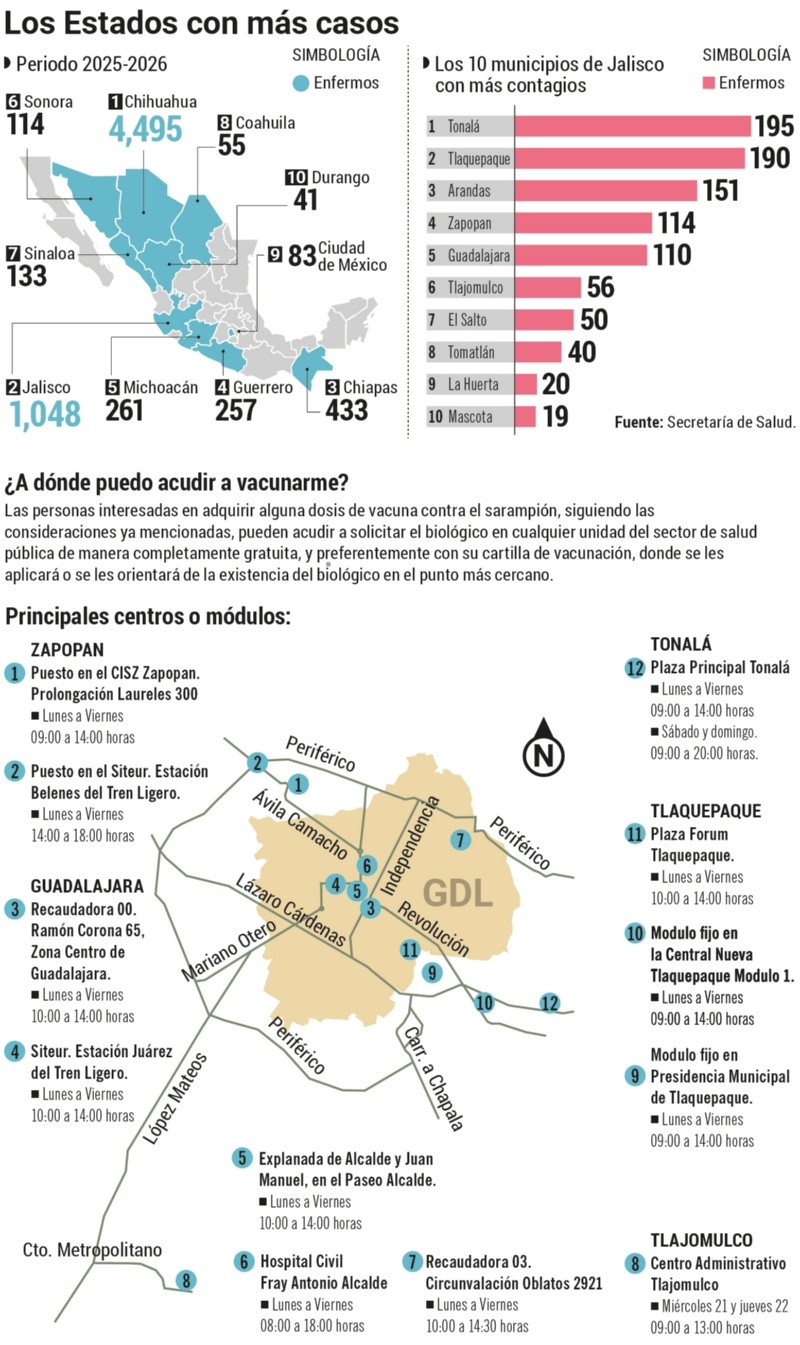 Jalisco enfrenta actualmente un brote de sarampión que ha encendido las alertas sanitarias, particularmente en los municipios de Tonalá y Tlaquepaque, que concentran el mayor número de casos confirmados en el Estado. Lejos de minimizar el escenario, las autoridades reconocen que se trata del brote más importante registrado en años recientes, pero ya se despliega una estrategia reforzada para contenerlo.El secretario de Salud, Héctor Raúl Pérez Gómez, informó que la respuesta institucional se ha intensificado con nuevas acciones de campo. Destaca la ampliación de brigadas de vacunación que recorrerán colonias identificadas como de mayor riesgo en la Zona Metropolitana de Guadalajara. Para ello, se contrató de manera emergente a un centenar de trabajadores de la salud, quienes se sumarán a pasantes, prestadores de servicio social y personal reconvertido de otras áreas. A este esfuerzo se suma una colaboración inédita con la Secretaría de la Defensa Nacional, cuyo personal participará en las brigadas para multiplicar la capacidad operativa. Las acciones forman parte de los llamados cercos epidemiológicos, una estrategia que busca frenar la propagación del virus mediante vacunación intensiva en los puntos con mayor incidencia, sumándose Zapopan y Arandas.“El dinamismo de un brote de este tipo obliga a ajustar las estrategias todos los días”, explicó Pérez Gómez, quien precisó que el objetivo es mitigar la transmisión en un plazo máximo de 90 días, aunque la meta operativa es lograrlo en el próximo mes. Por ahora, descartó la suspensión generalizada de clases, aunque insistió en que la vacunación es la herramienta más eficaz para cortar la cadena de contagios.Camila González, una adolescente que enfermó en noviembre pasado, describe la experiencia como “dos semanas insoportables”. Fiebre persistente, insomnio y una comezón intensa marcaron sus días. Otro testimonio refleja la preocupación en las comunidades escolares. Carmen, madre de familia en Tlaquepaque, consideró acertada la decisión de cerrar temporalmente un plantel tras detectarse contagios. Su hijo no estaba vacunado y el temor creció con cada noticia del brote. Por eso pide acciones contundentes a la autoridad.Las autoridades sanitarias reconocen que el brote se explica, en parte, por rezagos acumulados en la cobertura de vacunación, además del aumento de reuniones sociales y la relajación de medidas preventivas durante el cierre de año. Actualmente, Jalisco dispone de más de un millón de dosis disponibles. Aunque encabeza los contagios recientes a nivel nacional, el mensaje oficial insiste en que hay capacidad de respuesta, vacunas suficientes y una estrategia en marcha. El reto, coinciden autoridades y especialistas, no es el abasto, sino lograr que la población acuda a vacunarse y cierre la puerta al sarampión. Camila González padeció sarampión en noviembre pasado, cuando, piensa, se contagió en su trabajo. Nunca había padecido la enfermedad de pequeña, pero a los 16 años, afirma, han sido las dos “peores semanas de mi vida”. No salió de su cuarto, la comida se la llevaba su mamá a la cama y todas las noches, especialmente durante la primera semana, sufría de insomnio debido a la fiebre que no cedía y a la comezón que originaba el salpullido, sobre todo en los brazos y piernas. “Los primeros días con sarampión son insoportables... no puedes dormir, no puedes estar acostada ni quieta en un solo lugar porque te sientes incómoda. Te duelen las piernas, los brazos, la cabeza. Te sientes muy débil y la comezón también es insoportable, y lo peor es que si te rascas te quedan las cicatrices. Te dan una crema para aliviar la hinchazón y la comezón, pero a mí no me sirvió. De verdad que han sido las dos peores semanas”, dijo. La segunda semana, aunque ya con menos síntomas y sin fiebre, aún sufría de insomnios, dolor de cabeza, sensación de debilidad, falta de apetito y falta de sueño. Para Camila, el salpullido, la incomodidad y el dolor de cabeza, son “lo peor del sarampión”.“Tener sarampión fue horrible. Muchos compañeros en la escuela contaban cómo era tenerlo, pero no crees y no los entiendes hasta que de verdad estás en tu cama sin poder dormir y llorando del dolor y la comezón que sientes en el cuerpo”, concluyó. Por otra parte, cerrar la escuela y mandar a los estudiantes a su casa para tomar clases presenciales fue la mejor decisión que pudieron tomar las autoridades educativas, municipales y estatales, refirió Carmen, madre de familia del plantel educativo en Tlaquepaque que fue clausurado en octubre pasado tras registrarse el primer brote de sarampión al interior de una escuela en el Área Metropolitana de Guadalajara. Su hijo, en sexto grado de primaria, no está vacunado contra la enfermedad, por lo que la preocupación y el temor de su madre crecía conforme pasaban los días. “Nos dio miedo porque los niños no están vacunados y fue algo nuevo, porque hace muchos años que no sucedía esto (un brote de sarampión en las escuelas). Fue algo muy desconcertante”, dijo.Al regreso a clases presenciales, Carmen vigilaba estrictamente las medidas de salubridad impuestas por las autoridades educativas: uso de cubrebocas en todo momento y revisión de manos y boca por alguna señal de sarampión. Además, ante la mínima sospecha, como gripa o calentura, era recomendable no llevar al menor a la escuela. Por lo pronto, autoridades del plantel enfatizaron en que la vigilancia ha sido permanente y todos los días se hacen chequeos de los alumnos para descartar un nuevo brote de sarampión. Una de ellas, quien prefirió mantener el anonimato, recuerda que fueron dos semanas de trabajo intenso y de sanitización de las instalaciones a fin de garantizar la seguridad de la comunidad educativa.A partir del análisis de la cobertura de vacunación en Jalisco y del comportamiento reciente del brote de sarampión, la Secretar