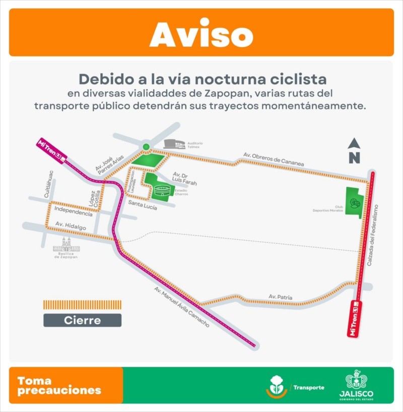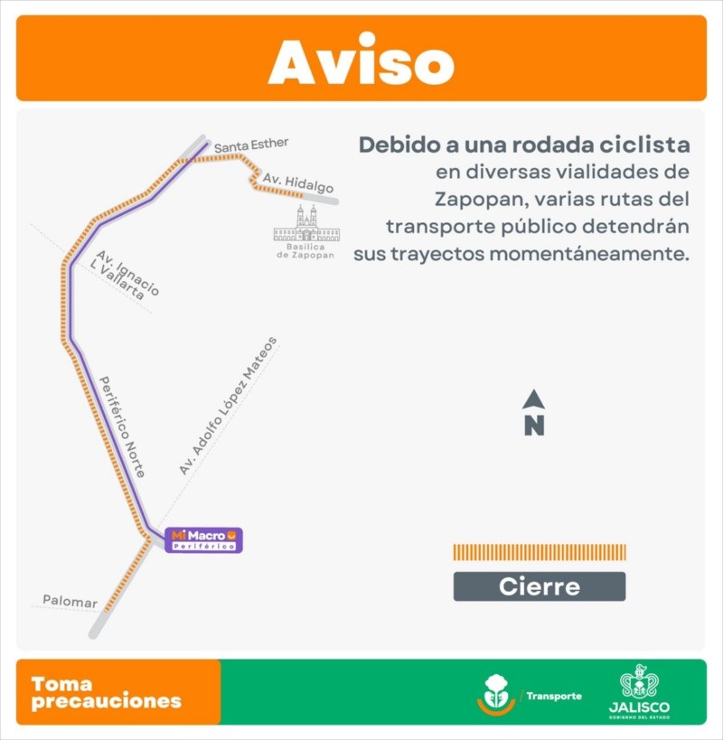 Por su parte el viernes 12 de diciembre debido a una rodada ciclista en Zapopan, las siguientes rutas se detendrán en un horario de 8:00 am a las 10:00 am.