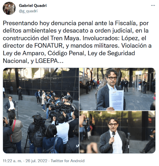Por presuntas violaciones a la ley al declarar el proyecto del Tren Maya como de seguridad nacional, el diputado panista, Gabriel Quadri interpuso una denuncia ante la Fiscalía General de la República (FGR) contra el Presidente Andrés Manuel López Obrador.Al acudir a las oficinas de la FGR, Quadri afirmó que López Obrador está violando la Constitución y la Ley de Seguridad Nacional al tratar de encubrir los delitos ambientales que se están cometiendo debido a la construcción del Tren Maya."El Presidente López está violando la Ley de Seguridad Nacional que establece los casos en los que se puede haber afectado la seguridad nacional y las cosas, proyectos y decisiones que pueden poner en riesgo la seguridad nacional. Esperemos que la FGR actúe", indicó.Y añadió: "Esta es una denuncia fundamental, inédita me parece en la historia moderna del país, porque estamos enfrentando delitos ambientales muy graves, cometidos por la autoridad y en los cuales está involucrado el Ejército, en algo gravísimo, algo que nunca se había visto en la historia de México en el cual las Fuerzas Armadas fueran puestas en un estado de vulnerabilidad tan grande como lo ha hecho el presidente López, en el caso del Tren Maya".GC