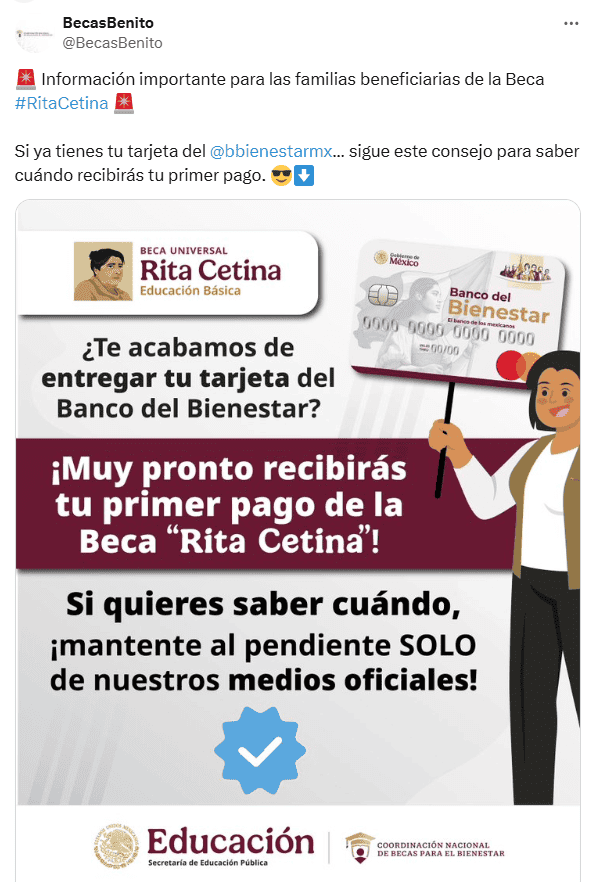 Este lunes 10 de marzo, el coordinador nacional de las Becas para el Bienestar, Julio León, dio a conocer en "La Mañanera del Pueblo" en Palacio Nacional que un grupo de beneficiarios de la Beca Rita Cetina recibirán el primer pago, correspondiente al bimestre enero-febrero, en el mes de marzo, a través de un depósito en su tarjeta del Bienestar.Según el funcionario, la entrega de tarjetas sigue realizándose, sin embargo, quienes ya la tienen, recibirán el dinero a partir del miércoles 12 de marzo.Julio León dijo en su participación en "La Mañanera del Pueblo" de hoy que "La Presidenta (Sheinbaum) nos ha instruido que quienes recibieron su tarjeta en el mes de febrero ya este miércoles 12 de marzo estarán recibiendo el primer suministro en esta tarjeta que comprende el primer bimestre que es enero y febrero 2025". Se espera que quienes reciban la tarjeta de forma posterior reciban en dinero de la beca en el mes de abril, pero también que se dé a conocer el calendario oficial.La Beca Rita Cetina, creada por el gobierno de la Presidenta Claudia Sheinbaum, comenzará a entregarse este año, iniciando con los estudiantes de secundaria.El pago para este 2025 contempla un depósito bimestral de mil 900 pesos por estudiante, a los cuales se les podrán sumar 700 pesos más por cada alumno del mismo nivel escolar de la misma familia, todos tienen que haber realizado su registro de manera correctamente el programa de becas de la Secretaría del Bienestar.*Mantente al día con las noticias, únete a nuestro canal de WhatsAppOF