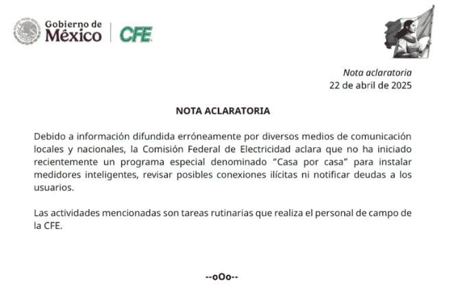 Luego de que la Comisión Federal de Electricidad (CFE) diera a conocer que no se ha desplegado ningún operativo a nivel nacional bajo el nombre Casa por Casa y confirmó que esas acciones son parte de su rutina diaria, te contamos cómo es."Debido a información difundida erróneamente por diversos medios de comunicación locales y nacionales, la Comisión Federal de Electricidad aclara que no ha iniciado recientemente un programa especial denominado "Casa por Casa" para instalar medidores inteligentes, revisar posibles conexiones ilícitas ni notificar deudas a los usuarios. Las actividades mencionadas son tareas rutinarias que realiza el personal de campo de la CFE", se lee en el comunicado.El personal de la CFE realiza una revisión detallada de los siguientes aspectos:Los trabajadores oficiales de la Comisión Federal de Electricidad deben cumplir con las siguientes características:Es importante recordar que el personal de la CFE no está autorizado a solicitar pagos en efectivo, ya que todos los cobros se realizan únicamente a través de los canales oficiales.Si tienes dudas sobre la identidad de un trabajador, no le permitas el acceso a tu domicilio y comunícate de inmediato al número gratuito de la Comisión: 071.EE
