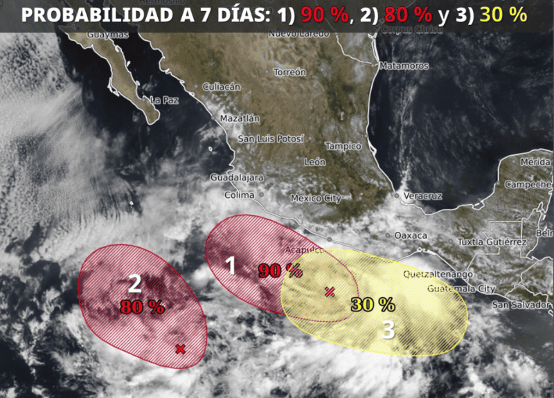 El pronóstico del Servicio Meteorológico Nacional (SMN), fuente climática oficial del Gobierno de México, prevé la posibilidad de que dos ciclones tropicales se formen en la cuenca del Pacífico este fin de semana; de hacerlo, llevarían los nombres de "Bárbara" y "Cosme", pero hoy se afianza la probabilidad que detrás de ellos se genere "Dalila", aunque habrá que observar su evolución.La Comisión Nacional del Agua (Conagua) informó el mediodía de este sábado 7 de junio que vigila tres zonas en el océano Pacífico. A través de su cuenta en X, compartió:1) Zona de baja presión al sur de Guerrero, mantiene 90% de probabilidad para desarrollo ciclónico en 48 horas y en 7 días. Se localiza a 300 km al sur de Acapulco, Guerrero, y se desplaza hacia el oeste-noroeste, a una velocidad de 24 km/h.Se espera que evolucione a ciclón tropical en el transcurso de este día, frente a costas de Guerrero.2) Zona de baja presión al suroeste de las costas de Jalisco y Colima, mantiene 70% de probabilidad para desarrollo ciclónico en 48 horas y 80% en 7 días. Se localiza a 950 km al sur-suroeste de Punta San Telmo, Michoacán, y se desplaza lentamente hacia el noroeste.Se espera que evolucione a ciclón tropical durante este fin de semana o los primeros días de la próxima semana, al suroeste de las costas de Jalisco y Colima.3) Se prevé la formación de una zona de baja presión al sur de las costas de Chiapas y Oaxaca; incrementa a 30% su probabilidad para desarrollo ciclónico en 7 días.Una línea seca prevalecerá sobre el norte de México, continuará interactuando con la corriente en chorro subtropical y divergencia, por lo que se prevén vientos fuertes con lluvias y chubascos en el norte y noreste de la República Mexicana; así como posible formación de torbellinos en zonas de Chihuahua (este) y Coahuila (noroeste).Zona de baja presión con alta probabilidad para desarrollo ciclónico o posible ciclón tropical al sur de las costas de Guerrero, su circulación y desprendimientos nubosos, además de la proximidad de la vaguada monzónica, ocasionarán lluvias muy fuertes a puntuales intensas, oleaje elevado y fuertes rachas de viento en Guerrero, Oaxaca y Chiapas.Por su parte, canales de baja presión sobre la Sierra Madre Occidental, el centro y sureste de la República Mexicana, en combinación con una corriente de bajo nivel en el mar Caribe, ingreso de humedad del océano Pacífico y golfo de México, además de divergencia, originarán lluvias y chubascos con descargas eléctricas en la península de Yucatán, el occidente, centro, oriente y sureste del país, pronosticándose lluvias puntuales fuertes en Jalisco, Colima, Michoacán, Puebla y Veracruz.Finalmente, una circulación anticiclónica en niveles medios de la atmosfera mantendrá el ambiente caluroso a muy caluroso sobre gran parte de la República Mexicana, prevaleciendo la onda de calor en los estados de Sonora (sur), Chihuahua, Coahuila (oeste y suroeste), Nuevo León (sur), Tamaulipas (suroeste), San Luis Potosí (norte), Zacatecas, Durango, Aguascalientes, Sinaloa, Nayarit, Jalisco, Colima, Michoacán, Guerrero (noroeste y oeste), Oaxaca (centro y sur) y Campeche (norte y oeste), Yucatán (oeste) y Quintana Roo (centro y este).Con información del Servicio Meteorológico Nacional * * * Mantente al día con las noticias, únete a nuestro canal de WhatsApp * * *OA