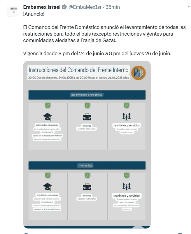 Luego de que el presidente de Estados Unidos, Donald Trump, anunciara un alto al fuego entre Irán e Israel, y que este hubiera sido confirmado por ambas partes, la Embajada de México en Israel anunció el levantamiento de todas las restricciones para todo el país, a excepción de las vigentes en las zonas aledañas a la Franja de Gaza, donde el ejército continúa con su ofensiva.A través de una publicación en su cuenta de X, la Embajada comunicó las nuevas indicaciones del Comando del Frente Doméstico israelí, que en días anteriores, en medio de las tensiones por el conflicto bélico, había modificado los lineamientos para la protección de la población civil.Así, desde este martes, los connacionales en Israel que no se encuentren cerca de Gaza podrán realizar sin restricciones actividades educativas, trabajar y acudir a reuniones y servicios.Por otro lado, los que se ubiquen en zonas aledañas a la Franja de Gaza, también pueden realizar actividades educativas y trabajar, y acudir a reuniones y servicios de menos de 2 mil personas, a excepción de ciertas zonas.La región ha vivido una escalada de violencia desde el 13 de junio, cuando Israel comenzó una ofensiva contra instalaciones militares y del programa nuclear iraní, en una serie de ataques que fueron respondidos por Irán.Aunque tras el anuncio del alto al fuego de Trump ambos países confirmaron el acuerdo, poco después Tel Aviv y Teherán se acusaron mutuamente del lanzamiento de misiles.En caso de requerir asistencia o protección consular, la Embajada recuerda a la comunidad mexicana sus contactos:En Israel: 054-316-6717 Desde el exterior: +(972) 54-316-6717infoisr@sre.gob.mx* * * Mantente al día con las noticias, únete a nuestro canal de WhatsApp * * *MB