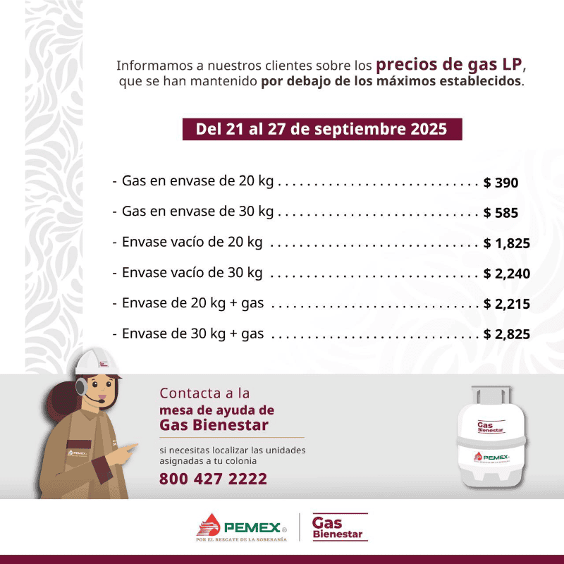 Gas Bienestar, creado en 2021 por la administración federal, nació con la finalidad de frenar la especulación en el mercado del gas LP, garantizar una distribución segura y aliviar el gasto en los hogares. Actualmente, su cobertura se concentra principalmente en la Ciudad de México. Este programa, respaldado por el Gobierno de México, tiene como meta ofrecer a las familias una opción más justa y accesible en el suministro de gas LP.Como parte de su operación regular, dio a conocer las tarifas que estarán vigentes del de 2025; los precios se mantienen en un rango competitivo frente a las compañías privadas, con la intención de asegurar que los hogares capitalinos y de la zona metropolitana dispongan de una alternativa confiable y asequible.Estos precios reflejan el compromiso de proporcionar un energético esencial a costos accesibles dentro de los límites establecidos por la Comisión Nacional de Energía.-Gas en envase de 20 kg: $390-Gas en envase de 30 kg: $585-Envase vacío de 20 kg: $1,825-Envase vacío de 30 kg: $2,240-Envase de 20 kg con gas: $2,215-Envase de 30 kg con gas: $2,825Estos precios se mantienen dentro de los topes máximos establecidos por las autoridades regulatorias, como parte de la estrategia de Gas Bienestar para ofrecer un servicio de calidad con cilindros supervisados y sellos de garantía que aseguren el 100% del contenido.Solicitar el suministro de Gas Bienestar es un proceso sencillo y accesible. A través de su cuenta de X, este programa informó que la única manera de solicitar la venta de cilindros es por pedido.La empresa, que opera con camiones equipados con tecnología avanzada para garantizar seguridad y localización, invita a los consumidores a contactar al centro de ayuda al número 800 427 2222 para cualquier consulta o servicio. YC