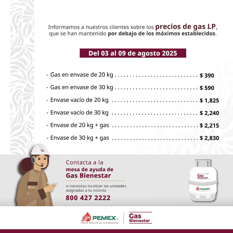 Costo del Gas Bienestar en la semana del 04 al 09 de agosto