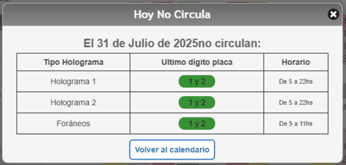 El programa Hoy No Circula limita la circulación de los autos en función del último dígito de la placa y el color del engomado, con el objetivo de prevenir, minimizar y controlar la emisión de contaminantes a la atmósfera de la Zona Metropolitana del Valle de México. Recuerda que desde el pasado lunes 1 de julio el Hoy No Circula tiene modificaciones; pues entró en vigor en las zonas metropolitanas del Valle de Toluca y de Santiago Tianguistenco en el Estado de México, por ello aquí te explicamos todo lo que tienes que saber al respecto.Según el informe más reciente del Sistema de Monitoreo Atmosférico de la Ciudad de México (CDMX) con corte a las 19:00 horas, la calidad del aire en la capital del país y la zona conurbada es aceptable por lo que los niveles de contaminación no son lo suficientemente altos como para activar la contingencia ambiental.Por lo anterior para este jueves 31 de julio del 2025 el El Hoy No Circula aplica con normalidad para los siguientes autos en la CDMX y el Edomex: Mientras que los autos con los hologramas 00 y 0 están exentos de las limitaciones establecidas en el programa, así como los vehículos eléctricos e híbridos. Para que mañana puedas tomar tus precauciones, te recordamos que el horario del Hoy No Circula es desde las 5:00 de la mañana a las 10:00 de la noche, sin embargo, para los automóviles con placas foráneas, la restricción será de 5:00 a 11:00 horas.A partir del martes 1 de julio de 2025, el programa se amplió con la inclusión de nuevos municipios del Estado de México.NA