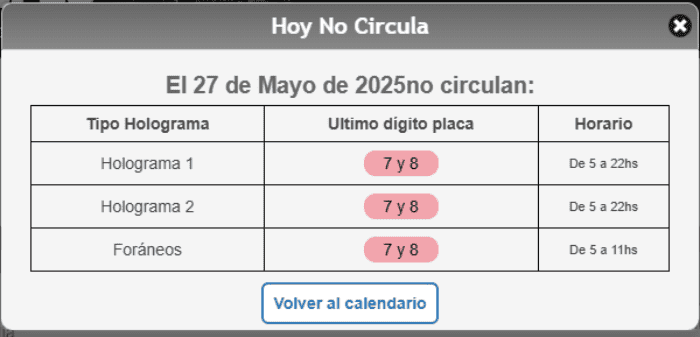 El programa Hoy No Circula limita la circulación de los autos en función del último dígito de la placa y el color del engomado, con el objetivo de prevenir, minimizar y controlar la emisión de contaminantes a la atmósfera de la Zona Metropolitana del Valle de México. Según el informe más reciente del Sistema de Monitoreo Atmosférico de la Ciudad de México (CDMX), con corte a las 16:00 horas la calidad del aire en la capital del país y la zona conurbada es aceptable, por lo que los niveles de contaminación no son los suficientemente altos como para activar el Doble Hoy No Circula, por lo que el programa aplica con normalidad para mañana.En ese sentido para el próximo martes 27 de mayo de este 2025 los siguientes autos no podrán circular en la Ciudad de México (CDMX) y el Estado de México (Edomex):Mientras que los autos con los hologramas 00 y 0 están exentos de las limitaciones establecidas en el programa, así como los vehículos eléctricos e híbridos. Para que mañana puedas tomar tus precauciones, te recordamos que el horario del Hoy No Circula es desde las 5:00 de la mañana a las 10:00 de la noche, sin embargo, para los automóviles con placas foráneas, la restricción será de 5:00 a 11:00 horas.El Hoy No Circula aplica en las 16 alcaldías de la CDMX y en 18 municipios de Edomex:NA