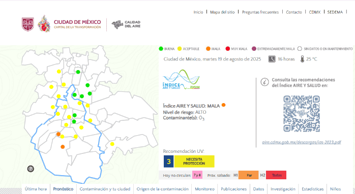Según el informe más reciente del Sistema de Monitoreo Atmosférico de la Ciudad de México (CDMX), con corte a las 16:00 horas, la calidad del aire en la capital del país y la zona conurbada es mala, por lo que existen condiciones para que la Comisión Ambiental de la Megalópolis (CAMe) active la contingencia ambiental y el Doble Hoy No Circula.