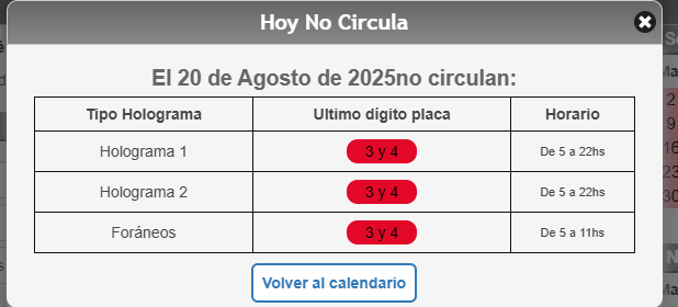 Sin embargo, hasta la publicación de esta nota no se han implementado ninguna medida al respecto, por ello el próximo miércoles 20 de agosto de este 2025 el programa Hoy No Circula aplica de forma habitual para los siguientes autos en la Ciudad de México (CDMX) y el Estado de México (Edomex):