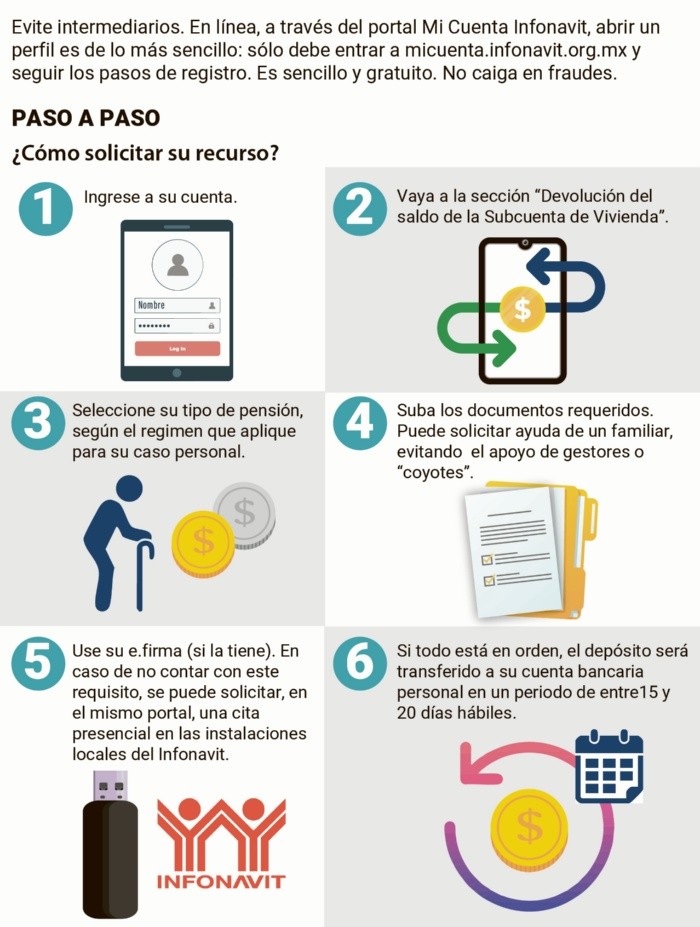 De acuerdo con lo establecido por el Instituto del Fondo Nacional de la Vivienda para los Trabajadores (Infonavit), el dinero de la Subcuenta de Vivienda de la persona no se pierde, existiendo la posibilidad de que sea recuperado por los familiares directos, como los hijos o cónyuges. En algunos casos también pueden solicitarlo los padres o la pareja en concubinato, siempre y cuando se acredite la unión como tal. Pero eso no es todo, pues si no hubo beneficiarios directos, éstos pueden solicitarlo los herederos designados por testamento o por resolución judicial. Para acceder al recurso se puede acudir a las instalaciones del Infonavit a iniciar el trámite, considerando como requisitos:Este trámite se realiza de manera presencial, pero antes se debe generar una cita desde el portal del Infonavit (portalmx.infonavit.org.mx). En ella debe dirigirse a la sección “mi ahorro” y enseguida elegir la opción “retiro de mi ahorro”. La subcuenta del Infonavit es una cuenta individual donde se depositan las aportaciones patronales del 5% del salario registrado de la persona trabajadora ante el IMSS, y la cual es administrada por el Infonavit. Este dinero no lo aporta el trabajador, sino el empleador, y se acumula mes a mes a lo largo de la vida laboral formal de la persona empleada. De esta forma, si la persona termina su vida laboral sin haber hecho uso de algún crédito del Instituto, puede proceder al retiro de estos recursos una vez que ha realizado su proceso de jubilación. Ese es el requisito principal señalado en la Ley del Infonavit para poder hacerlo. El trabajador debe tomar en cuenta que sólo puede llevar a cabo el trámite de devolución de este dinero cuando llegue a la edad de retiro. Pero antes de solicitar la devolución es importante que tome en cuenta cuándo empezó a cotizar ante el Infonavit y bajo qué régimen se encuentra, ya que de ello dependerá la forma en que le serán devueltos los recursos y el proceso que debe llevar a cabo. En primer lugar, está el caso de aquellas personas que empezaron a cotizar antes del 1 de julio de 1997. Con ellos, su dinero puede estar resguardado en tres fondos distintos, dependiendo de las fechas en las que trabajó y el patrón realizó las aportaciones al Infonavit. Primero está el Fondo de Ahorro 1972-1992. Ahí se depositaron las aportaciones del empleador realizadas de mayo de 1972 a febrero de 1992. Luego está la Subcuenta de Vivienda de 1992. Ahí se encuentran las aportaciones recibidas entre marzo de 1992 y junio de 1997. Finalmente, la Subcuenta de Vivienda 1997, que contiene las aportaciones realizadas por su empleador a partir del 1 de julio a la fecha.Para saber cuánto ahorro tiene en su subcuenta de vivienda, puede consultar en la sección “Cuánto ahorro tengo” de Mi Cuenta Infonavit (micuenta.infonavit.org.mx), o bien, verificar todos sus movimientos a través del Resumen de Movimientos. Registrarse en Mi Cuenta Infonavit no tiene ningún costo y no importa si tiene o no un empleo formal, sólo necesita su Número de Seguridad Social, CURP, RFC y un correo electrónico propio. También puede acudir a los kioscos de autoservicio del Infonavit ubicados en su localidad. TRÁMITE GRATUITOSi requieres más información al respecto, acuda a su Centro de Servicio Infonavit (CESI) más cercano o llame a Infonatel, en el número, 800-008-3900. Recuerde que, en cualquiera de los casos, el Infonavit siempre le devolverá su dinero, el trámite es gratuito y no requiere de intermediarios. Esta recomendación del Infonavit es para evitar acudir a gestores o “coyotes”, quienes suelen cobrar altos porcentajes, de entre el 10 al 30% de lo que tenga la persona en su subcuenta.EN UN SÓLO PAGOEl dinero que tengan en su subcuenta de vivienda las personas pensionadas bajo el régimen de 1973, en cualquiera de los tres fondos, recibirán su dinero de vuelta en una sola exhibición y podrán realizar el trámite en “Mi Cuenta Infonavit” (micuenta.infonavit.org.mx) o en su Centro de Servicio Infonavit (Cesi) más cercano. Para ello necesitarán tener la resolución de pensión o la negativa de pensión expedida por el Instituto Mexicano del Seguro Social (IMSS); firma electrónica (e.firma) vigente emitida por el Servicio de Administración Tributaria (este requisito sólo aplica si el trámite lo va a realizar desde Mi Cuenta Infonavit). También se requiere el número de CLABE de la cuenta bancaria de la persona que realiza el trámite, ya que este monto sólo se entrega mediante transferencia bancaria. Es importante que la cuenta acepte depósitos por la cantidad a devolver. Además, la persona no debe tener algún crédito vigente con el Infonavit o algún otro trámite en proceso. Si la persona se pensionó bajo el régimen de 1997, el dinero que tenga en la Subcuenta de Vivienda de 1992 y en la Subcuenta de Vivienda de 1997 serán enviados a su Afore para que se sume al total de los ahorros que determinarán el monto de su pensión. Los recursos que tengan en el Fondo de Ahorro 1972-1992 serán devueltos por el Infonavit en una sola exhibición, pero para ello deben hacer el trámite de devolución en línea o el centro de servicio más cercano, con los documentos antes mencionados. Luego están quienes comenzaron a cotizar al Infonavit después del 1 de julio de 1997. En este caso, sus ahorros se encuentran depositados únicamente en la Subcuenta de Vivienda 1997 y sólo pueden pensionarse bajo el régimen de 1997. Con ellos, el dinero acumulado en la subcuenta, más los rendimientos generados, se enviarán a la Afore en la que se está registrado para que se sume al total de los recursos con los que se determinará el monto de su pensión. Para obtener la devolución de los recursos, dependiendo de la resolución o negativa de pensión que otorgue el IMSS, deberá hacer la solicitud ante el Afore.2.4 billones de pesos hay actualmente en la Subcuenta de Vivienda de los trabajadores formales del país, seg