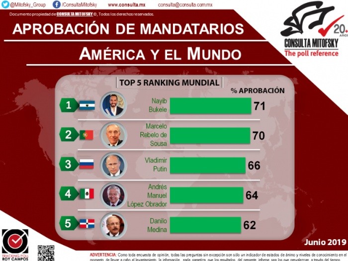 El Presidente de México, Andrés Manuel López Obrador, está ubicado en el top cinco del ranking de aprobación de mandatarios en el mundo, mejor evaluado que Donald Trump.De acuerdo con Consulta Mitofsky, López Obrador se colocó en el sitio cuatro, sólo por debajo del presidente de El Salvador, Nayib Bukele; Marcelo Rabelo de Sousa, de Portugal, y Vladimir Putin, de Rusia.Consulta Mitofsky presentó el estado de la aprobación ciudadana en varios países, y en esta ocasión ofrece la situación para 19 mandatarios de América y nueve más en Europa, Asia y Australia, en un ejercicio realizado el 19 de junio.La empresa encuestadora aclaró que aunque las metodologías utilizadas en cada país pueden variar, es una oportunidad para ver en un solo documento el nivel que alcanza cada mandatario y compararlos entre ellos.En el ejercicio, Consulta Mitofsky destaca en sus principales hallazgos para el caso de América que tres de los presidentes medidos obtienen evaluación sobresaliente, con más del 60% de aprobación, aunque ninguno de los 19 mandatarios de la región obtuvo una calificación alta.De acuerdo con la encuestadora, el promedio de los presidentes para el mes de junio de América del Norte se ubica en 46%, una disminución de cinco puntos porcentuales debido a la baja en la aprobación del presidente de México y el primer ministro de Canadá.En el ranking de mandatarios de América, López Obrador está situado en el segundo puesto, con el 64% de aprobación, en tanto que el presidente de Estados Unidos. Donald Trump, se ubica en el quinto lugar, con el 44%, y Justin Trudeau, de Canadá, ocupa el noveno lugar, con 31% de aprobación.Las evaluaciones, aclaró Consulta Mitofsky, son una forma de medir el trabajo de cada uno de los presidentes y "pueden o no mostrar totalmente la eficiencia y los logros de sus administraciones".Detalló que realizó una recopilación de encuestas publicadas en medios electrónicos de diversos países.GC