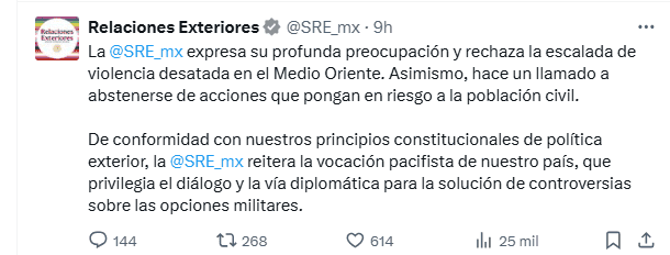 La Secretaría de Relaciones Exteriores (SRE) este viernes expresó “profunda preocupación” por la ofensiva que Israel inició contra Irán, rechazando la escalada de violencia desatada en el Medio Oriente.Además, hizo un llamado a abstenerse de acciones que pongan en riesgo a la población civil."De conformidad con nuestros principios constitucionales de política exterior, la SRE reitera la vocación pacifista de nuestro país, que privilegia el diálogo y la vía diplomática para la solución de controversias sobre las opciones militares", dijo.Ante estos acontecimientos recientes en la región, se pidió a los y las connacionales en Qatar inscribirse en el Sistema de Registro para Personas Mexicanas en el Exterior (SIRME).En caso de emergencias para nacionales de México, la embajada de México en Qatar pidió comunicarse al (+974) 3363 4450, y para asuntos consulares, escribir al correo electrónico consularqat@sre.gob.mx.Después de que Israel inició esta ofensiva contra Irán, por lo que declararon estado de emergencia especial en Tel Aviv, las embajadas de México en Medio Oriente fueron reforzadas en su asistencia y protección consular a las personas mexicanas.Ante la escalada en el conflicto, Relaciones Exteriores indicó que se instruyó a las embajadas en la región a intensificar sus esfuerzos de asistencia y protección consular.En caso de emergencia o dudas sobre las condiciones en la región, la SRE, a cargo del canciller Juan Ramón de la Fuente, pidió contactar a las representaciones en Irán, Afganistán, Kirguistán, Pakistán, Tayikistán, Uzbekistán, Israel, Jordania y Líbano.Para la embajada de México en Israel, se puso a disposición el número 054 316 6717; para Jordania, 077 800 0494; para Líbano, 030 44598; y para las demás regiones el 989 121 224 463.La embajada de México en Israel indicó que el Frente de Comando Doméstico modificó el nivel de alerta, por lo que recomendó seguir las indicaciones emitidas en: https://www.oref.org.il/eng.* * * Mantente al día con las noticias, únete a nuestro canal de WhatsApp * * *MB