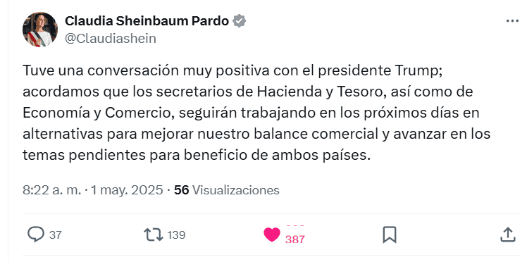 Este jueves 1 de mayo, la Presidenta de México, Claudia Sheinbaum Pardo, informó a través de un mensaje en sus redes sociales que sostuvo una conversación con su homólogo estadounidense, Donald Trump.En dicho diálogo, que Sheinbaum consideró positivo, los gobernantes acordaron que los secretarios de Hacienda, Edgar Amador, y el titular del Tesoro de Estados Unidos, Scott Bessent, así como de Economía, Marcelo Ebrard, y Comercio de Estados Unidos, Howard Lutnick, seguirán trabajando en los próximos días en alternativas para mejorar el balance comercial entre ambas naciones."Tuve una conversación muy positiva con el presidente Trump; acordamos que los secretarios de Hacienda y Tesoro, así como de Economía y Comercio, seguirán trabajando en los próximos días en alternativas para mejorar nuestro balance comercial y avanzar en los temas pendientes para beneficio de ambos países", escribió en X.Hasta la fecha, la presidenta de México, Claudia Sheinbaum, y el mandatario estadounidense Donald Trump han sostenido seis llamadas telefónicas para abordar diversos temas, entre ellos la seguridad, el problema del fentanilo, y migración.El 6 de noviembre de 2024, tras las elecciones presidenciales en Estados Unidos, Sheinbaum felicitó a Trump por su victoria y sostuvo una conversación telefónica con él.Durante esta llamada, ambos líderes intercambiaron felicitaciones y expresaron su disposición a mantener un diálogo abierto sobre temas bilaterales, incluyendo asuntos fronterizos.Posteriormente, el 27 de noviembre, la Presidenta mexicana y el virtual ganador volvieron a cruzar una conversación telefónica para hablar sobre la estrategia de seguridad que aplica México, así como su estrategia para frenar el consumo del fentanilo.El 3 de febrero de este año, Sheinbaum y Trump llegaron a un acuerdo para suspender temporalmente la imposición de aranceles entre ambos países. En esta conversación, México se comprometió a enviar 10 mil elementos de la Guardia Nacional a la frontera con EU.El 6 de marzo, Trump acordó con Sheinbaum suspender y alzar la imposición de los aranceles a las importaciones de México, hasta el 2 de abril como una "muestra de respeto".La penúltima llamada ocurrió este 17 de abril, sin dar más detalles ambos mandatarios destacaron que fue productiva para alcanzar buenos acuerdos. Y la última fue este 1 de mayo Día del Trabajo.* * * Mantente al día con las noticias, únete a nuestro canal de WhatsApp * * *MB