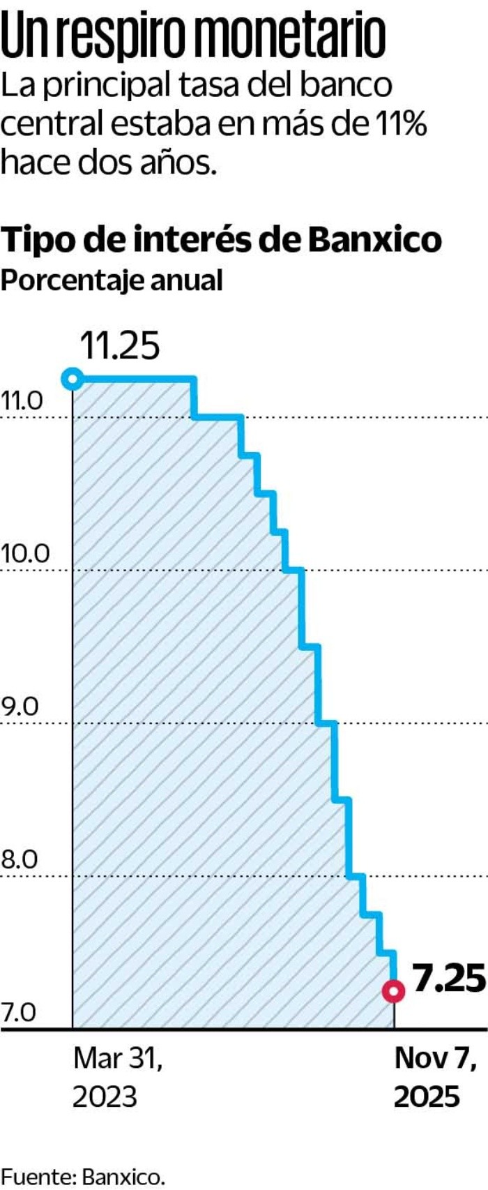 El Banco de México (Banxico) bajó nuevamente su tasa de interés en 25 puntos base, tal y como lo esperaba la mayoría del mercado, con lo cual se colocó en 7.25%.Es la tercera vez consecutiva que el banco central mexicano reduce en un cuarto de punto la referencia que sirve para determinar el costo del dinero prestado.Pero en lo que va del 2025 ya son siete ocasiones que ha disminuido el objetivo para la Tasa de Interés Interbancaria; tres de 25 puntos base y cuatro de medio punto.La encuesta de Citi anticipó este movimiento con 36 de los 37 analistas participantes.Fue en febrero pasado cuando el Banco de México inició su ciclo de bajas con 50 puntos base, cuando la tasa objetiva se encontraba en 9.50%.La decisión de política monetaria de Banxico se da una semana después de que la Reserva Federal de Estados Unidos ajustó sus tipos de interés por segunda vez para dejarla en un rango de entre 3.75% y 4%.También a un día de que el Inegi difunda el reporte de la inflación de todo el mes de octubre cuyo indicador se colocó en 3.63% a tasa anual en la primera quincena, con los mayores aumentos de precios en electricidad, transporte aéreo y servicios turísticos en paquete.
