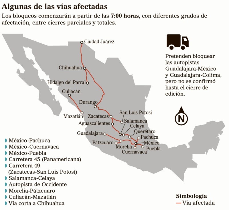 La Cámara Nacional del Autotransporte de Carga llamó a sus asociados a estar atentos al paro nacional y bloqueos carreteros desde hoy, principalmente hacia la capital, con afectaciones en Occidente, Bajío, Noreste y Norte. La duración es indefinida y advierten posibles impactos en cruces fronterizos y aduanas.En una circular a sus afiliados, la Cámara señaló que la movilización incluirá transportistas y campesinos, afectando la movilidad y la logística nacional como presión a autoridades federales y estatales.La semana pasada, la Asociación Nacional de Transportistas confirmó un paro carretero junto con campesinos. Su presidente, David Estévez Gamboa, señaló que la protesta responde a la falta de avances en temas clave: inseguridad vial, extorsiones, alza del diésel y escaso apoyo al campo.“Los campesinos, los agricultores y los transportistas de este país estamos convocando a un paro nacional. Para que vean que no somos tan inconscientes, pues que pase la famosa Semana Santa… que todo el mundo salga a pasear, a vacacionar, pero el 6 de abril vamos a parar… tenemos la necesidad de volvernos a manifestar”. Destaca que la Confederación Nacional de Transportistas Mexicanos y la Cámara Nacional del Autotransporte de Carga han informado que no participarán, pero no descartan que sus agremiados lo hagan de manera individual.Anoche, la Secretaría de Gobernación informó que la Presidenta ha encabezado reuniones con productores y, de noviembre a la fecha, se han destinado tres mil 412 millones de pesos para compensar los precios de los granos, en beneficio de 40 mil 910 personas. “A nadie se le ha negado el apoyo”.Sobre los transportistas, indicó que la mayoría ha decidido no movilizarse, ya que la Guardia Nacional atiende las demandas de seguridad y han mejorado los trámites.Por su parte, la Confederación de Cámaras Industriales y organismos del autotransporte -ANPACT, ANTP, Canacar y Canapat- llamaron a privilegiar el diálogo y garantizar la continuidad de las actividades productivas, reafirmando su compromiso con la certidumbre, la productividad y el crecimiento económico del país. CT