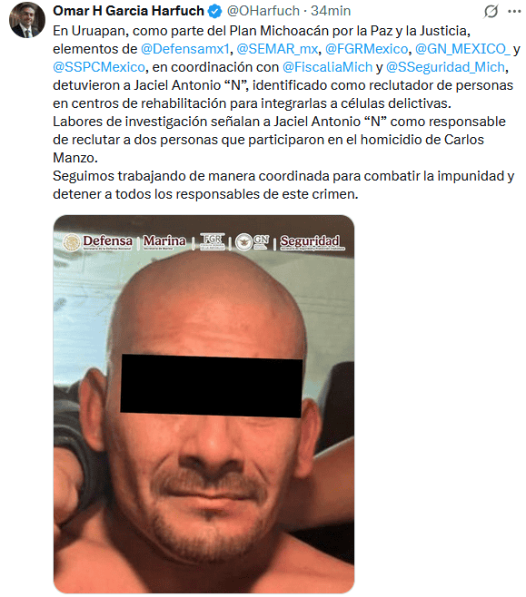 El caso del asesinato del alcalde de Uruapan, Carlos Manzo, sigue evolucionando, según las autoridades federales. Hoy se supo de una nueva detención. Estos son los detalles:El secretario de Seguridad y Protección Ciudadana, Omar García Harfuch, indicó que en Uruapan, como parte del Plan Michoacán por la Paz y la Justicia, elementos del gabinete de Seguridad, en coordinación con la Fiscalía de Michoacán y la Secretaría de Seguridad de Michoacán, detuvieron a Jaciel Antonio “N”, identificado como reclutador de personas en centros de rehabilitación para integrarlas a células delictivas.Labores de investigación señalan a Jaciel Antonio “N” como responsable de reclutar a dos personas que participaron en el homicidio de Carlos Manzo.Aseguró que siguen trabajando de manera coordinada para combatir la impunidad y detener a todos los responsables de este crimen.Con respecto a los detenidos, presuntamente relacionados en el homicidio de Carlos Alberto Manzo Rodríguez, el gobernador Alfredo Ramírez Bedolla señaló que "hay algo muy relevante y tiene que ver con la estrecha coordinación que ha tenido mi gobierno, la Fiscalía del estado y Omar García Harfuch, secretario de Seguridad y Protección Ciudadana (del Gobierno federal)."Esto nos ha permitido tener avances muy oportunos y certeros (en las investigaciones)", señaló.Destacó que ese trabajo conjunto ha permitido que haya detenidos por varias líneas de investigación."Todas las líneas de investigación están desplegadas con transparencia, con alta responsabilidad por parte de la Fiscalía General de Justicia del Estado, que también trabaja en temas de inteligencia con nuestra propia Secretaría de Seguridad Pública", expuso el mandatario.En ese sentido, confió en que como autoridades lograrán la vinculación a proceso de los siete escoltas y el operador criminal del Cártel Nueva Generación, Jorge Armando "N", alias "El Licenciado" o "El Contador".Recordó que el primer detenido (Jorge Armando) está relacionado con la autoría del atentado, y los otros siete son los escoltas del primer círculo de seguridad que tenía el alcalde independiente, Manzo Rodríguez.Y que "está la investigación muy avanzada, de que (los escoltas) hayan sido penetrados de alguna manera por el grupo de la delincuencia organizada"."Estoy seguro que se va a lograr (la vinculación a proceso), hay la confianza, también la familia (de Carlos Manzo) ha demostrado y ha dado su voto de confianza en las investigaciones y creo que esto ha sido y está siendo bien recibido y también está dándose una respuesta muy oportuna en este caso".Ramírez Bedolla reiteró que las investigaciones continúan y afirmó que, a diferencia de otros casos que tardan meses en mostrar resultados, "tenemos un excelente trabajo coordinado y confiamos en que se tenga la vinculación a proceso (de los detenidos) con la prisión preventiva de estas personas".A solicitud de la defensa de los implicados, se les otorgó la duplicidad del término y será hasta este próximo miércoles cuando se lleve a cabo la audiencia en la que el juez determinará si vincula o no a proceso a los imputados. * * * Mantente al día con las noticias, únete a nuestro canal de WhatsApp * * *OA