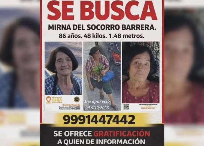 A casi un mes de la desaparición de la maestra Mirna Barrera Vera en Mérida, su búsqueda ha llegado a los estados de Campeche y Quintana Roo con el objetivo de que más personas ayuden para dar con el paradero de la mujer, extraviada desde el 9 de diciembre pasado.Este miércoles 7, la profesora jubilada cumple 87 años de edad.De acuerdo con la familia de la mujer, colectivos de Madres Buscadoras de los citados estados han compartido la imagen de la maestra en sus redes sociales y grupos de apoyo, para ampliar el rango de búsqueda más allá del estado de Yucatán.Por su parte, la Comisión de Búsqueda de Personas del Estado de Yucatán, en conjunto con la Comisión Nacional de Búsqueda, amplió la búsqueda a los municipios de Hunucmá, Tetiz, Kinchil, Celestún y en diversas zonas de la ciudad de Mérida. El organismo, dependiente de la Secretaría General de Gobierno, informó que estas acciones se desarrollan con la finalidad de garantizar el derecho de toda persona a ser buscada.Hay que señalar que la búsqueda no ha cesado, principalmente en Mérida donde se siguen difundieron imágenes de la señora Mirna en redes sociales y por medio de carteles en diferentes zonas, sobre todo en el centro, sur y poniente de la capital yucateca.MF