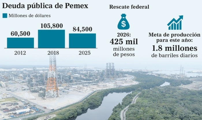 El Gobierno de México informó que en 2025 Petróleos Mexicanos (Pemex) logró reducir en 20% su deuda total, un resultado que no se había registrado en años y que ya es reconocido a nivel internacional por los mercados financieros y las principales agencias calificadoras.Durante su intervención en la conferencia matutina de la Presidenta Claudia Sheinbaum Pardo, Luz Elena González Escobar, titular de la Secretaría de Energía (Sener), destacó que este avance es resultado del Plan de Fortalecimiento de Pemex 2025-2035, presentado en agosto del año pasado, el cual tuvo como objetivo central fortalecer a la empresa pública del Estado, garantizar la seguridad y soberanía energética del país, y recuperar la solidez financiera de la petrolera."En 2025 se logró el fortalecimiento financiero de Pemex gracias a los instrumentos que, con gran apoyo de la Secretaría de Hacienda, se pusieron en marcha por primera vez. Logramos capitalizar a Pemex, cumplir puntualmente con todas sus obligaciones financieras y avanzar en el pago a proveedores", subrayó la funcionaria.González Escobar recordó que durante el periodo neoliberal, en apenas una década, Pemex incrementó su endeudamiento en casi 130%, convirtiéndose en la petrolera más endeudada del mundo. En contraste, afirmó que la estrategia aplicada en 2025 permitió revertir esta tendencia, al grado de que Moody's, Fitch y Standard y Poor's ya mejoraron la calificación crediticia de la empresa productiva del Estado.Además del fortalecimiento financiero, la titular de Energía resaltó avances operativos relevantes. Señaló que en 2025 se recuperó la integración vertical de Pemex, lo que permitió reducir costos y mejorar la eficiencia. Como resultado, se estabilizó la producción de petróleo y se alcanzó el volumen necesario para abastecer a las refinerías nacionales.Detalló que el Sistema Nacional de Refinación pasó de procesar poco más de 600 mil barriles diarios en 2018 a 1.2 millones de barriles diarios en 2025, lo que impulsó la producción de gasolinas, diésel y turbosina. En otros rubros, la secretaria González Escobar informó sobre la recuperación de la industria petroquímica y el fortalecimiento de la producción de fertilizantes, la cual se incrementó 21% en 2025, luego de haber sido prácticamente desmantelada en administraciones anteriores.Estos avances, dijo, contribuyen a apoyar al campo y a fortalecer la autosuficiencia alimentaria del país. De cara a 2026, González Escobar adelantó que la inversión en el sector hidrocarburos se incrementará 34%, con recursos públicos y mixtos destinados a proyectos estratégicos y a iniciativas de sustentabilidad para reducir emisiones contaminantes y adoptar nuevas tecnologías.Finalmente, reconoció el trabajo coordinado entre Pemex, la Secretaría de Hacienda y el seguimiento permanente de la Presidenta de la República, así como la labor de los trabajadores de la empresa, a quienes calificó como "una parte fundamental de la soberanía nacional".* * * Mantente al día con las noticias, únete a nuestro canal de WhatsApp * * * AS