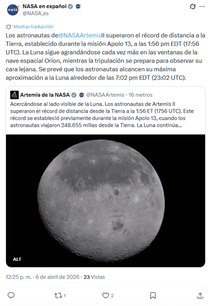 La nave Orión de la NASA se convirtió este lunes 6 de abril en la misión espacial tripulada a mayor distancia de la Tierra, superando el récord del Apolo 13, que en 1970 se alejó a 400 mil 171 kilómetros de nuestro planeta.La cápsula Orión, de la misión Artemis II, alcanzó este récord a las 12:57 horas del este de Estados Unidos mientras viajaba hacia la esfera de influencia de la Luna y a menos de una hora de que comiencen las observaciones durante el sobrevuelo del satélite natural."Aquí, desde la 'Cabina de la Integridad', al superar la mayor distancia que los seres humanos han recorrido jamás desde el planeta Tierra, lo hacemos honrando los extraordinarios esfuerzos y las proezas de nuestros predecesores en la exploración espacial humana", declaró el astronauta canadiense de la misión, Jeremy Hansen.La misión estadounidense, que despegó el pasado miércoles desde Cabo Cañaveral, en Florida, y tiene el objetivo de orbitar la Luna y regresar a la Tierra en diez días, sobrevolaría la Luna, según está programado, para las 14:45 hora del este de Estados Unidos (18:45 GMT), lo que concluirá a las 21:20 horas (01:20 del martes GMT)."Continuaremos nuestro viaje adentrándonos aún más en el espacio antes de que la Madre Tierra logre atraernos de regreso hacia todo aquello que tanto apreciamos. Pero, lo que es más importante, elegimos este momento para desafiar a esta generación, y a la siguiente, a asegurar que este récord no perdure por mucho tiempo", añadió Hansen.Durante este sobrevuelo, los cuatro astronautas a bordo de la Orión, Reid Wiseman, Christina Koch y Victor Glover, de la NASA, y Hansen, de la Agencia Espacial Canadiense, establecerán su propio récord de distancia con respecto a la Tierra, cuando se encuentren a 406 mil 777 kilómetros de nuestro planeta.El registro del Apolo 13 data del año de 1970, cuando la misión que popularizó la frase: “Houston, hemos tenido un problema” sufrió un fallo técnico que la obligó a rodear la Luna, aprovechando su gravedad para impulsarse de regreso a la Tierra.Uno de los momentos clave de la órbita lunar de Artemis II será el paso de los astronautas por la cara oculta de la Luna, que les permitirá fotografiar y ver con sus propios ojos esta parte del satélite.La última vez que un ser humano contempló en primera persona esta región de la Luna, que se oculta de nuestro planeta por la rotación sincrónica del satélite, fue en 1972, cuando la tripulación del Apolo 17 se convirtió en la última expedición en pisar la superficie lunar.El sobrevuelo de la Orión —equipada con 32 cámaras— permitirá estudiar con mayor detalle la cara oculta lunar, pero también provocará que los astronautas pierdan las comunicaciones con la Tierra durante unos 40 minutos, el tiempo que la Luna se interponga entre el planeta y la nave.La misión Artemis II saldrá de la influencia lunar mañana martes a las 13:25 hora del este, en el marco de su regreso a la Tierra.*Mantente al día con las noticias, únete a nuestro canal de WhatsAppOF